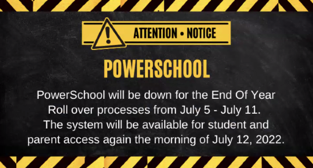 PowerSchool will be down for the End Of Year Roll over processes from July 5 - July 11. The system will be available for student and parent access again the morning of July 12, 2022. We apologize for any inconvenience this may cause and thank you for your patience and cooperation in this matter.